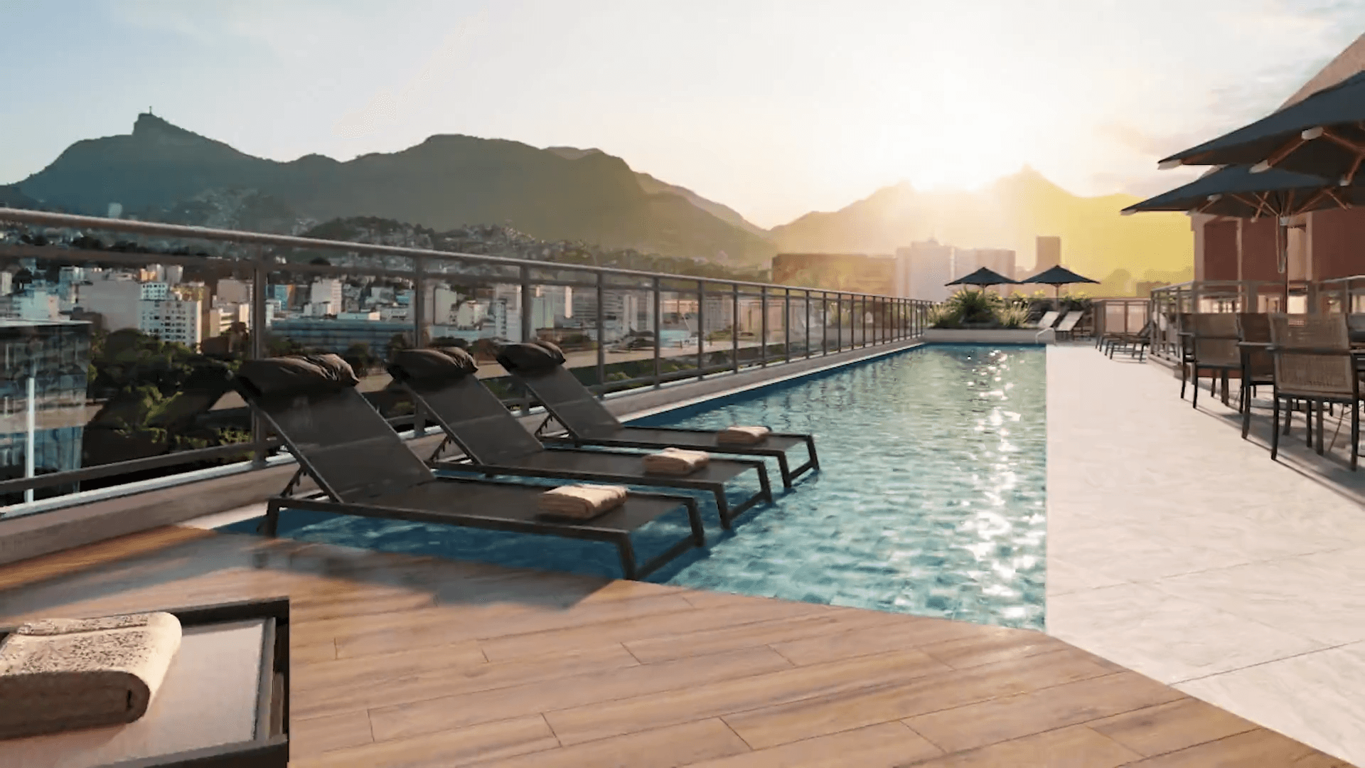 - Lazer no topo: rooftop com piscina e vista para a cidade;