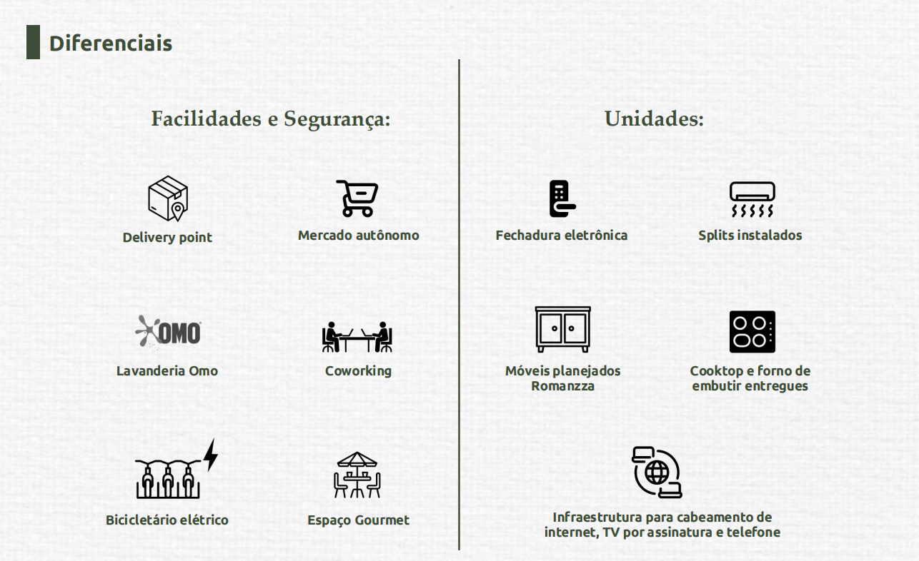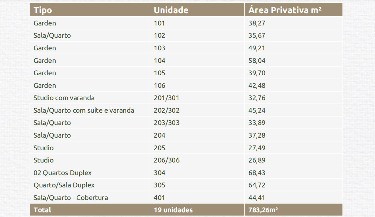 Todo o mobiliário e acabamentos dos imóveis estão listados no Memorial Descritivo.