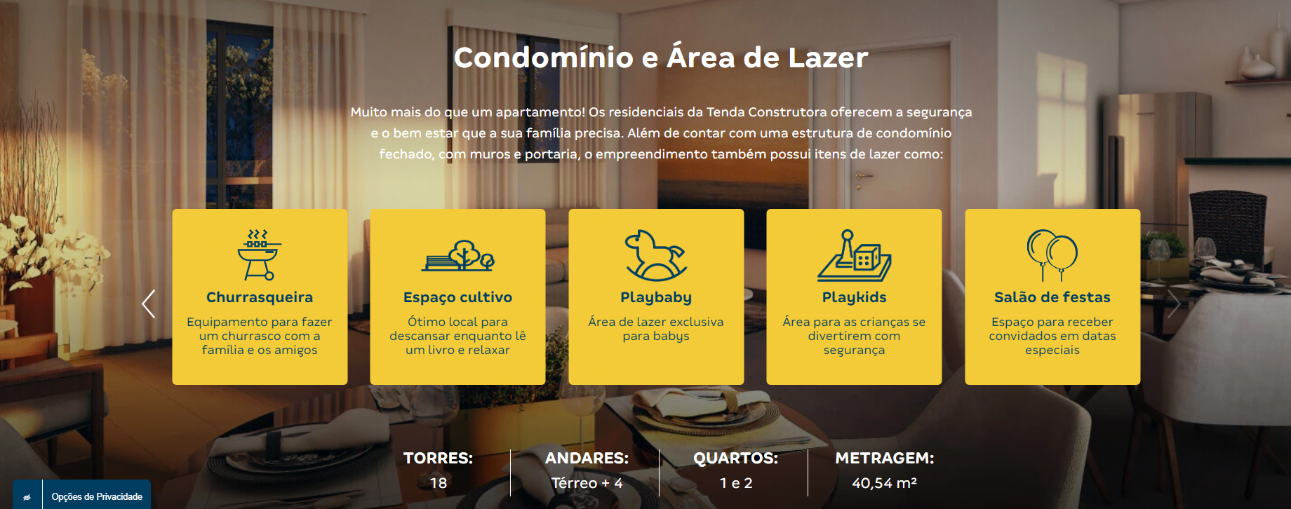 Muito mais do que um apartamento! Os residenciais da Tenda Construtora oferecem a segurança e o bem estar que a sua família precisa. Além de contar com uma estrutura de condomínio fechado, com muros e portaria, o empreendimento também possui itens de lazer.